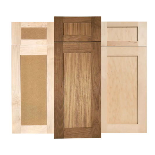 Our Shaker doors are made of Select Grade Maple with HDF or Maple center panels, Walnut with Walnut center panels, and Rift Sawn White Oak with Rift Sawn White Oak center panels.